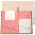 やさしい色合いに仕上げた今治タオルです。タオルの柄の「麻の葉模様」は伝統的な和柄の一種で、古くから麻はすくすくと真っ直ぐに伸びることから成長を願う縁起の良い柄とされています。