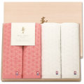やさしい色合いに仕上げた今治タオルです。タオルの柄の「麻の葉模様」は伝統的な和柄の一種で、古くから麻はすくすくと真っ直ぐに伸びることから成長を願う縁起の良い柄とされています。