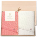 やさしい色合いに仕上げた今治タオルです。タオルの柄の「麻の葉模様」は伝統的な和柄の一種で、古くから麻はすくすくと真っ直ぐに伸びることから成長を願う縁起の良い柄とされています。