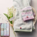 ころんとした形がかわいらしい「すずらん」と、すっきりと落ち着いた色合いの「さんかく模様」の今治タオル。