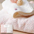 やわらかく淡い色と伝統柄から上品さが漂い、パイルのやさしい肌触りをふわりと感じる穏やかな日々を贈ります。繊細にあしらった縁起の良い「麻の葉模様」は、成長を願う柄として古くから愛され続けています。