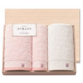 今治の匠が織り成すタオルのやわらかく淡い色と伝統柄から上品さが漂います。パイルのやさしい肌触りをふわりと感じる今治タオルです。高級感ある木箱入りで、贈り物に最適です。
