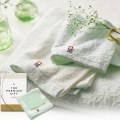タオルにふんわり花咲くカスミソウの花言葉は清らかな心・幸福・永遠の愛・そして「感謝」。可憐なカスミソウに心からの感謝をこめて。タオルのヘムに輝くシルバーのラメが、さりげない上品さを演出してくれます。
