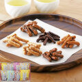 サクサクッとした食感に仕上げた、風味豊かなハチミツ入り黒糖かりんとう、ピーナッツの香ばしさと甘みが調和した、風味豊かなピーナツかりんとう、牛乳を生地に練り込み、サクサクッとした食感に仕上げた牛乳かりんとう、香ばしい黒ごまで仕上げ風味豊かな黒ごまかりんとう、チョコレートを生地にたっぷりと練り込み、カリッとかる~い食感に仕上げたチョコかりんとう、キャラメルを生地にたっぷりと掛け、しっとりと仕上げたキャラメルかりんとう。6種類のフレーバーを楽しめるかりんとう詰め合わせです。