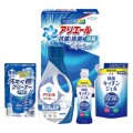 抗菌洗剤アリエールと、少量でたくさん洗える濃縮タイプの食器洗剤除菌ジェル、室内干しのイヤなニオイを防ぎ、ふっくら柔らかく仕上がる抗菌・消臭ソフターのギフトです。