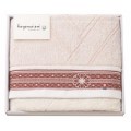 日本の伝統衣装である着物をイメージした今治タオル。繻子織で表現された着物の華やかで美しい帯や帯留めが特徴的です。優美な和の美しさとともに、パイル部分にはシンプルなラインのデザインで、和モダンな雰囲気を感じられるタオルに仕上げました。