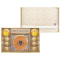 高級感があるホール型でキメ細かな生地が特徴のあっさりとした味わいでしっとりふわふわなチーズケーキと、国産のりんごと濃厚な風味と滑らかな口どけのカスタードクリームを使用した相性のよさが特徴の本格派のパイに、シュー生地をじっくり焼き上げサクサクな食感のシューラスクと、百十余年の歴史を重ねる今治タオルをセットしました