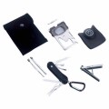 機能:ナイフ・缶切り・栓抜き・六角レンチ・蝶ネジ回し・レンズ・コンパス・マイナスドライバー・精密ドライバー(+・-)・定規・つめ切り・ハサミ・ヤスリ・ナイフ・甘皮切り・甘皮取り・耳かき・毛抜き