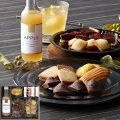 【内容】フルーツドリンク(アップル)180ml、キャラメルレーズンサンド×2、マドレーヌ(プレーン)、プチフィナンシェ(ショコラ)6個入、プチフィナンシェ(プレーン)6個入
