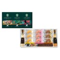 スターバックスの香り高いコーヒーを手軽に楽しめるドリップタイプの「オリガミ」と、3種類のミニバウムクーヘンをセットに。飛騨高山ファクトリーのドレッシングも入っています。