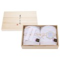 お慶びの七宝柄をジャガードで表現して、紗綾形模様を地づり紋織でヘムを際立たせて高級感を演出しました。豪華な木箱にセットアップをしてエレガントで上品な贈り物になっています。