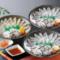 【内容】真ふぐ霜降り刺身(20g)×2、真ふぐたたき刺身(20g)×1、とらふぐ皮(20g)・ふくポン酢(10g)・もみじおろし(10g)×各3