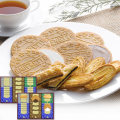 風味豊かなバニラクリームをサンドしたバニラゴーフレットや、上品な味わいに仕上げたチョコゴーフレット、何層にも重ねたパイ生地に細かく砕いたアーモンドを挟み、サックリと焼き上げたアーモンドパイ、チョコをサンドしたやさしい甘さのショコラスティックパイをセットしました。お菓子好きな人にも満足な詰合せです。