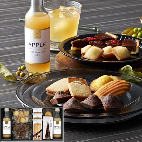 【内容】フルーツドリンク(アップル)180ml×2、キャラメルレーズンサンド×3、マドレーヌ(プレーン)、プチフィナンシェ(ショコラ)6個入、プチフィナンシェ(プレーン)6個入、チョコとクランベリーのタルト